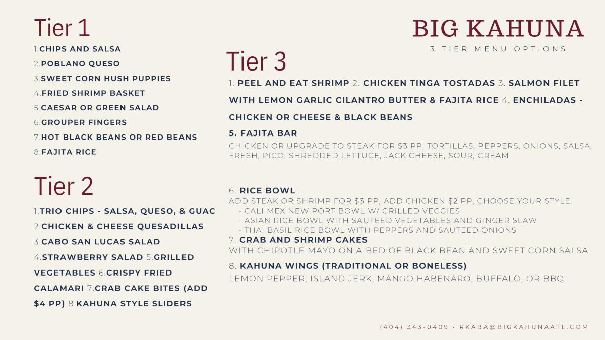 Big Kahuna is the perfect location for private parties, pre-set menus, buy-out options, large student group menus and other group meetings in the downtown Atlanta area. Host your corporate event. We are ideally located right next to: